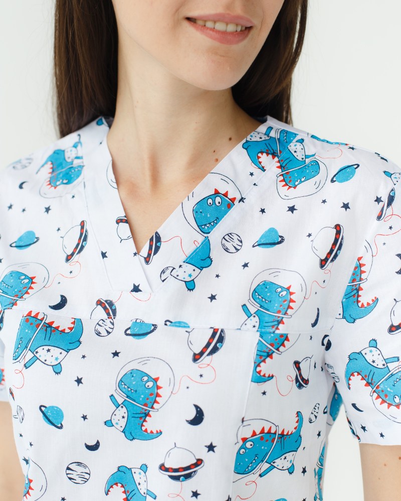 Жіночий костюм “Топаз” декорований принтом складається з медичної сорочки з короткими втачними рукавами, місткою кишенею-кенгуру та медичних штанів з вшитими кишенями.