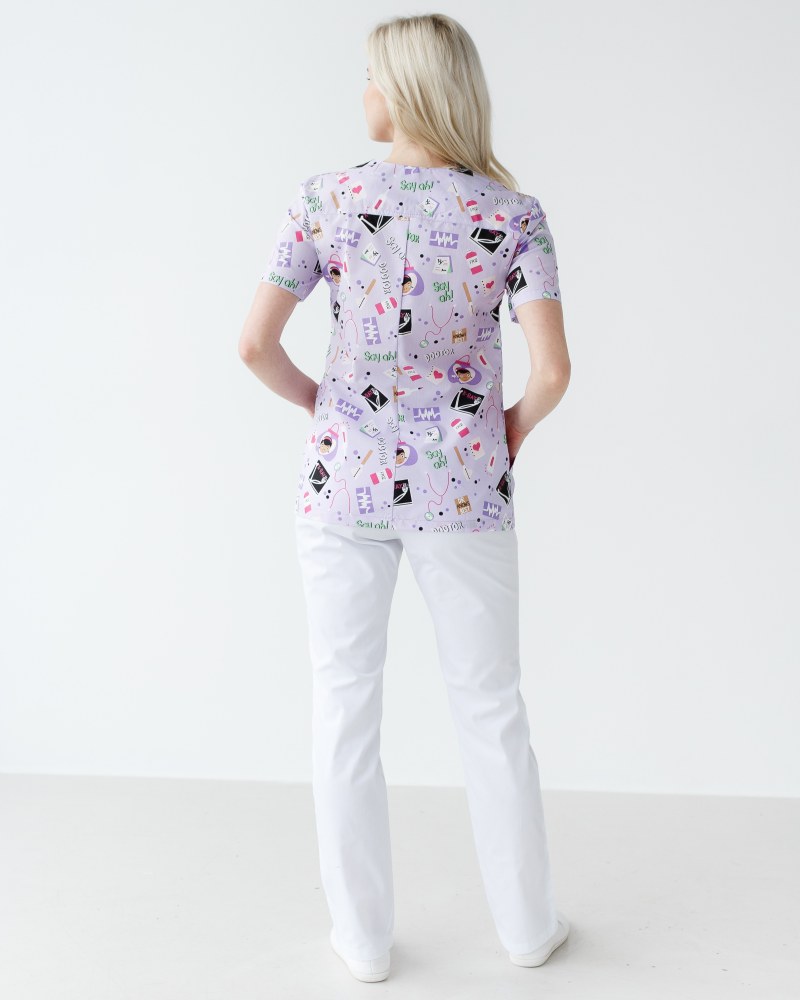 Жіночий костюм “Топаз” декорований принтом складається з медичної сорочки з короткими втачними рукавами, місткою кишенею-кенгуру та медичних штанів з вшитими кишенями.