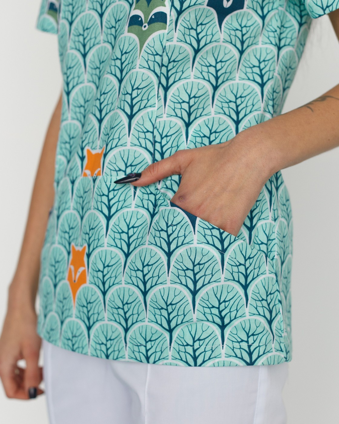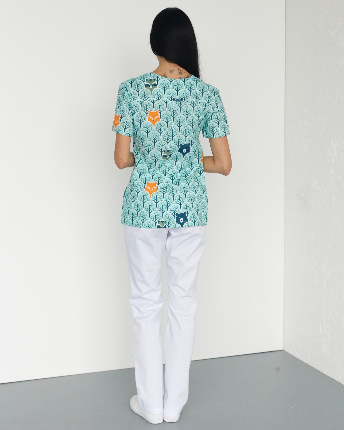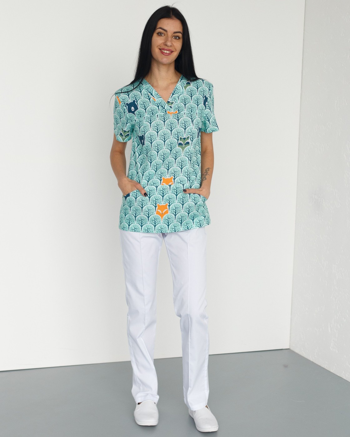 Жіночий костюм “Топаз” декорований принтом складається з медичної сорочки з короткими втачними рукавами, місткою кишенею-кенгуру та медичних штанів з вшитими кишенями.