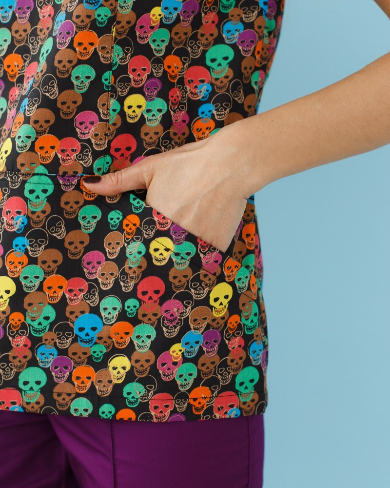 Жіночий костюм “Топаз” декорований принтом складається з медичної сорочки з короткими втачними рукавами, місткою кишенею-кенгуру та медичних штанів з вшитими кишенями.