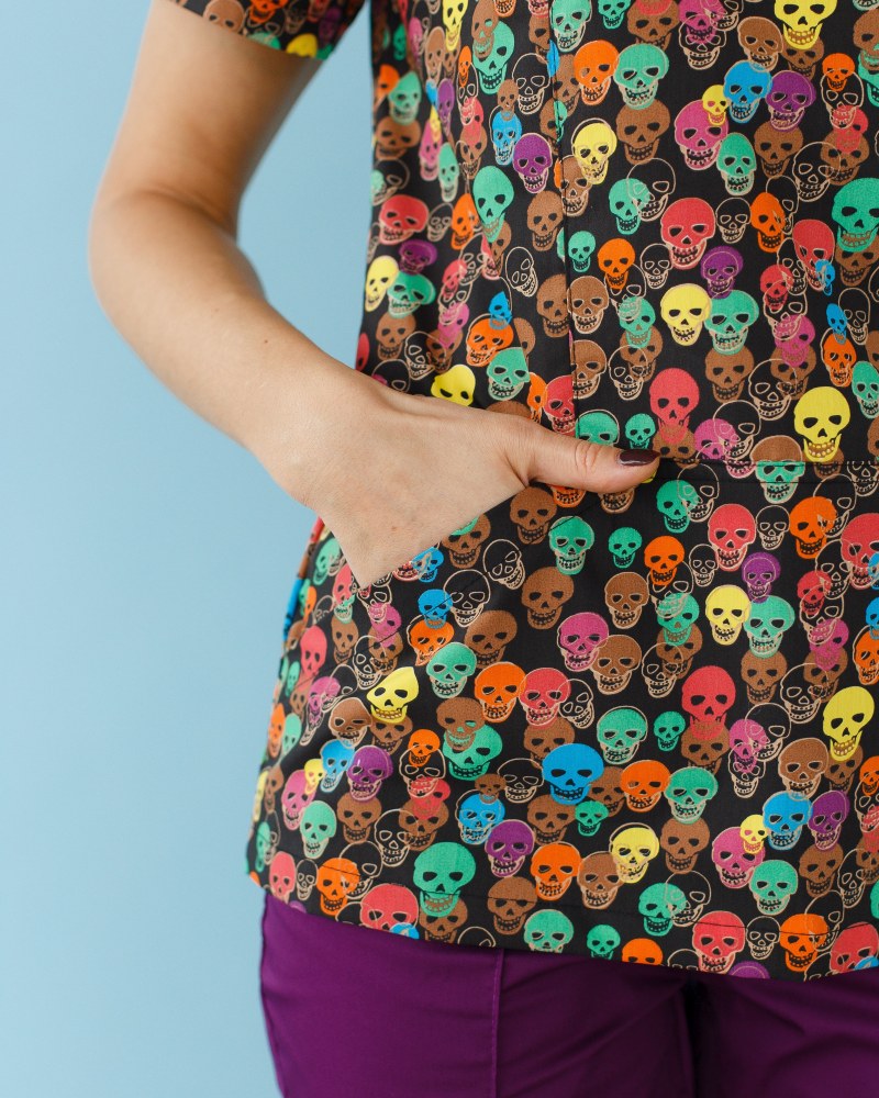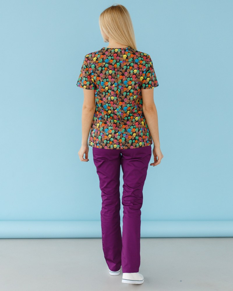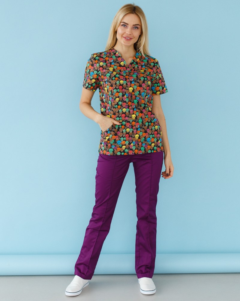 Жіночий костюм “Топаз” декорований принтом складається з медичної сорочки з короткими втачними рукавами, місткою кишенею-кенгуру та медичних штанів з вшитими кишенями.