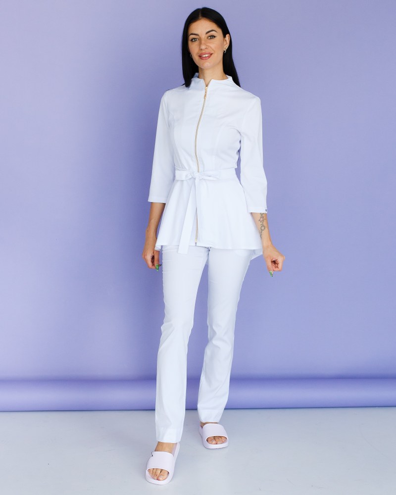Костюм жіночий медичний «Мішель» складається з медичної сорочки та штанів прямого фасону. Сорочка з рукавами 3/4 має оригінальний дизайн: широка баска наголошує на пропорційності фігури, а блискавка золотого кольору виступає контрастним акцентом. Є дві місткі кишені. Низ — штани прямого фасону на резинці. У комплекті є пояс-зав'язка, щоб ще більше підкреслити талію.