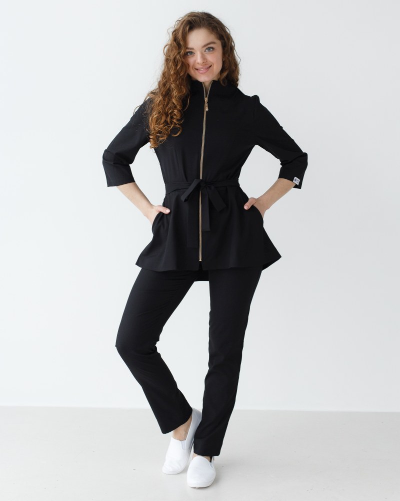 Костюм жіночий медичний «Мішель» складається з медичної сорочки та штанів прямого фасону. Сорочка з рукавами 3/4 має оригінальний дизайн: широка баска наголошує на пропорційності фігури, а блискавка золотого кольору виступає контрастним акцентом. Є дві місткі кишені. Низ - штани прямого фасону на резинці. У комплекті є пояс-зав'язка, щоб ще більше підкреслити талію.