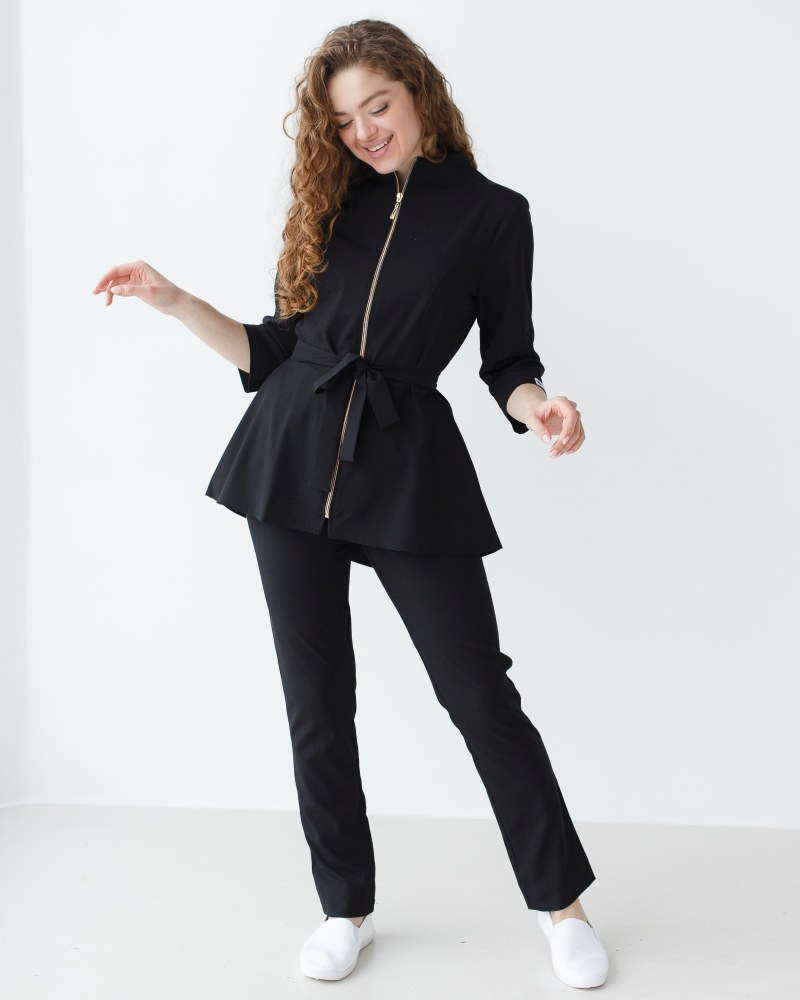 Костюм жіночий медичний «Мішель» складається з медичної сорочки та штанів прямого фасону. Сорочка з рукавами 3/4 має оригінальний дизайн: широка баска наголошує на пропорційності фігури, а блискавка золотого кольору виступає контрастним акцентом. Є дві місткі кишені. Низ - штани прямого фасону на резинці. У комплекті є пояс-зав'язка, щоб ще більше підкреслити талію.