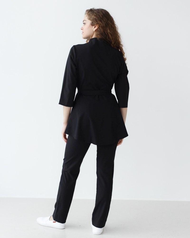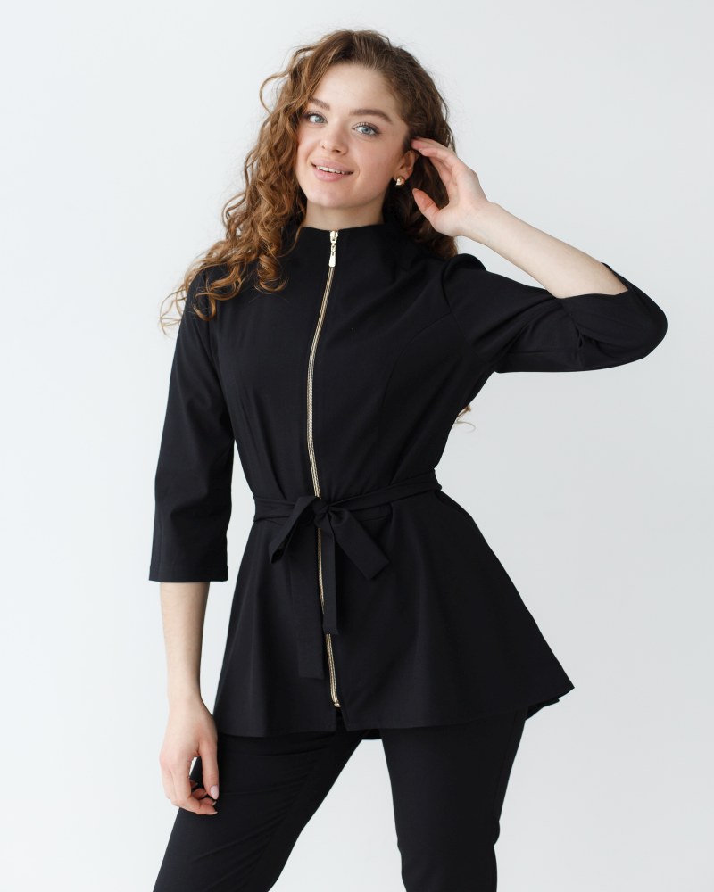 Костюм жіночий медичний «Мішель» складається з медичної сорочки та штанів прямого фасону. Сорочка з рукавами 3/4 має оригінальний дизайн: широка баска наголошує на пропорційності фігури, а блискавка золотого кольору виступає контрастним акцентом. Є дві місткі кишені. Низ - штани прямого фасону на резинці. У комплекті є пояс-зав'язка, щоб ще більше підкреслити талію.