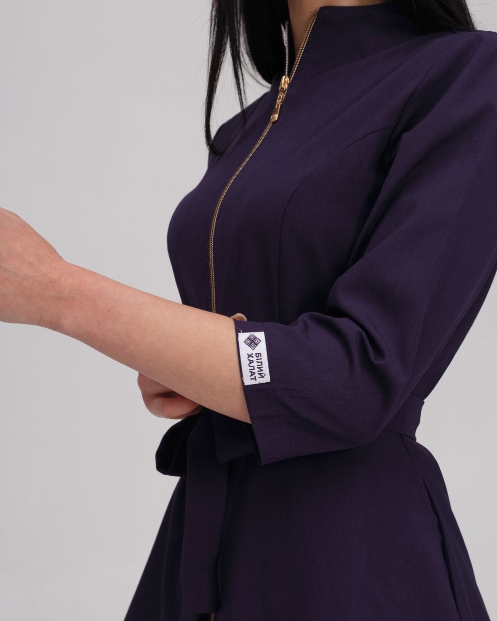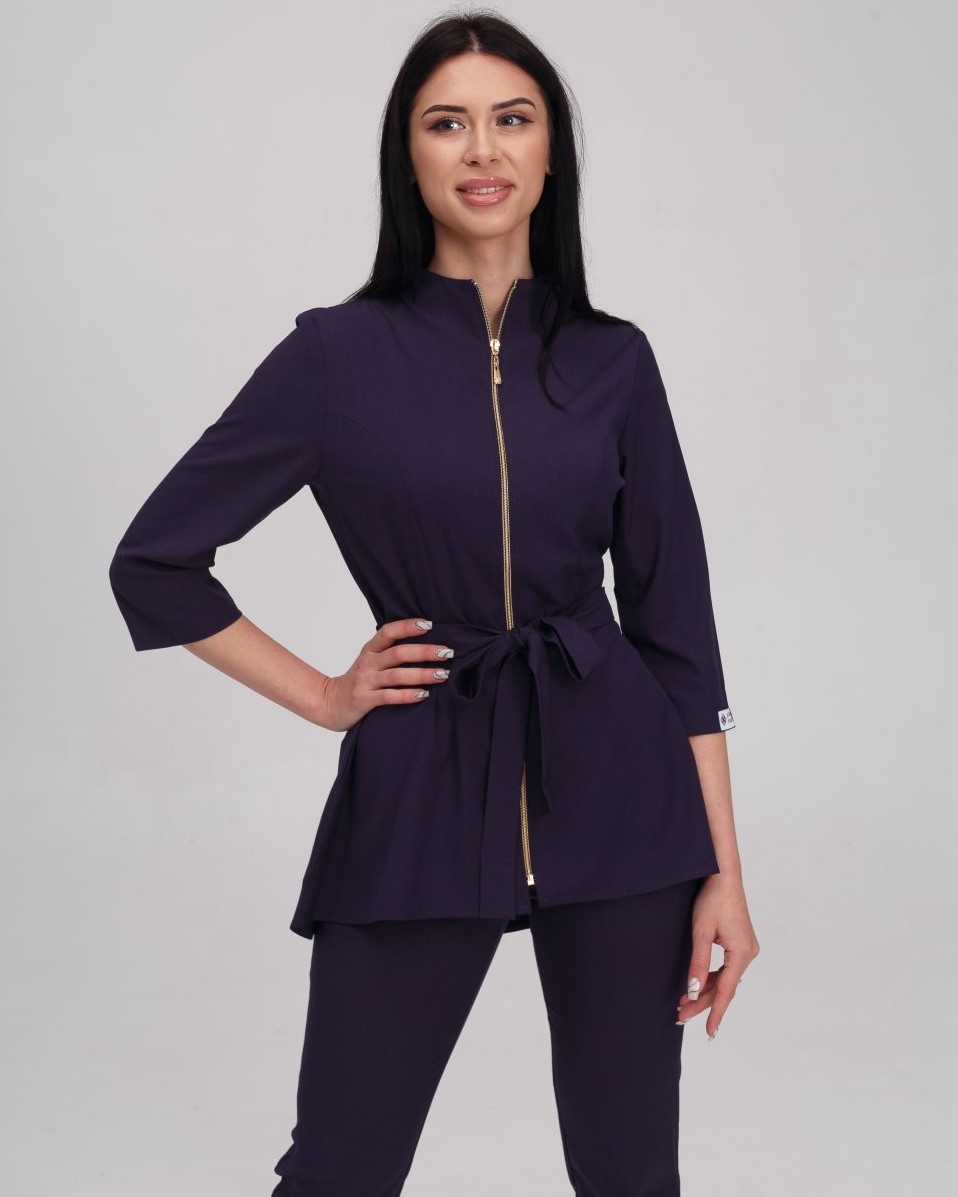 Костюм жіночий медичний «Мішель» складається з медичної сорочки та штанів прямого фасону. Сорочка з рукавами 3/4 має оригінальний дизайн: широка баска наголошує на пропорційності фігури, а блискавка золотого кольору виступає контрастним акцентом. Є дві місткі кишені. Низ - штани прямого фасону на резинці. У комплекті є пояс-зав'язка, щоб ще більше підкреслити талію.