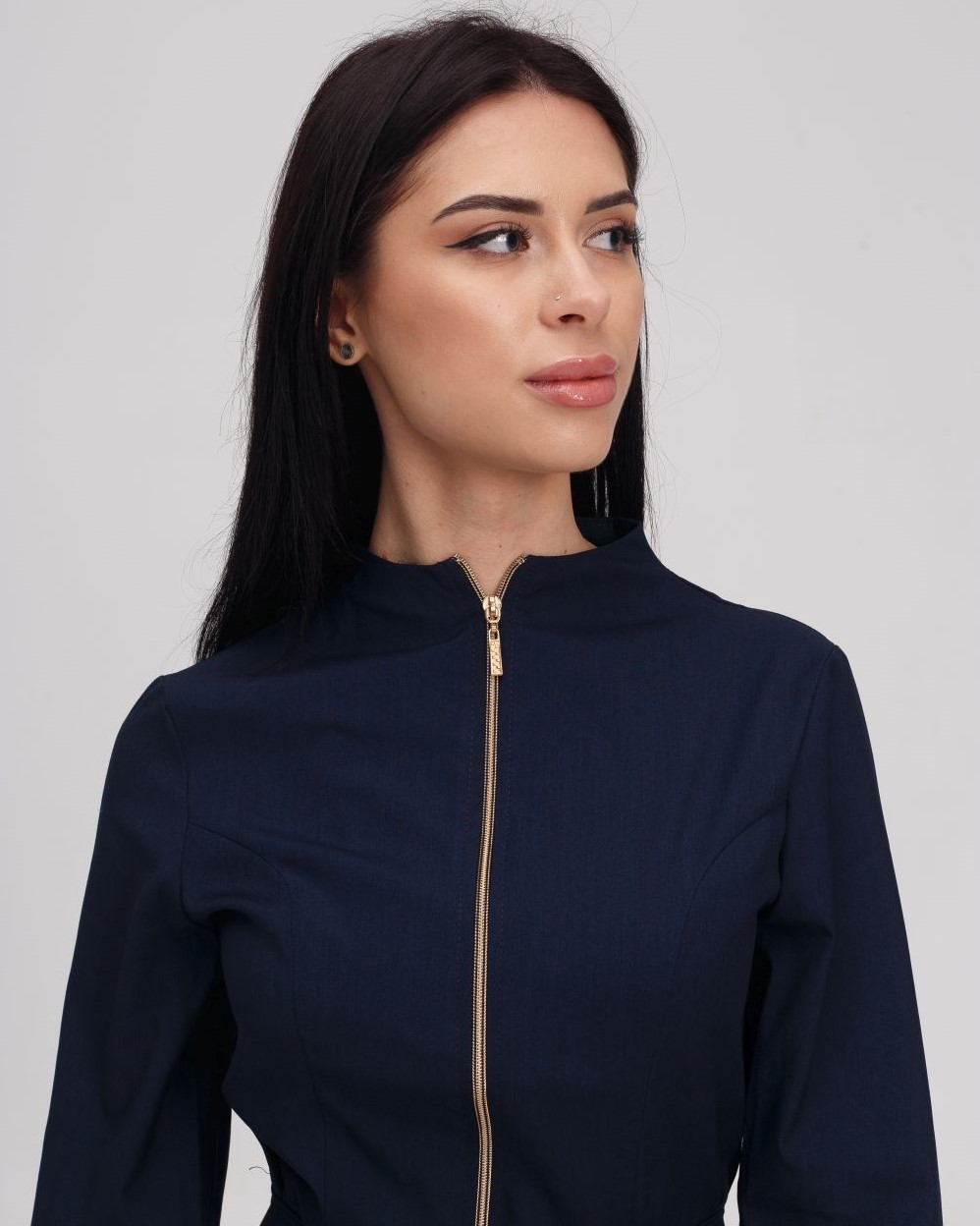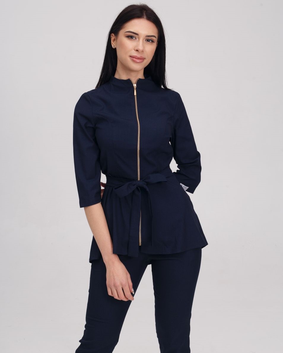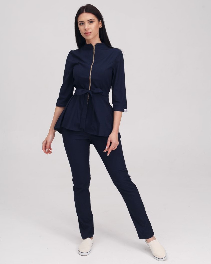 Костюм жіночий медичний «Мішель» складається з медичної сорочки та штанів прямого фасону. Сорочка з рукавами 3/4 має оригінальний дизайн: широка баска наголошує на пропорційності фігури, а блискавка золотого кольору виступає контрастним акцентом. Є дві місткі кишені. Низ - штани прямого фасону на резинці. У комплекті є пояс-зав'язка, щоб ще більше підкреслити талію.