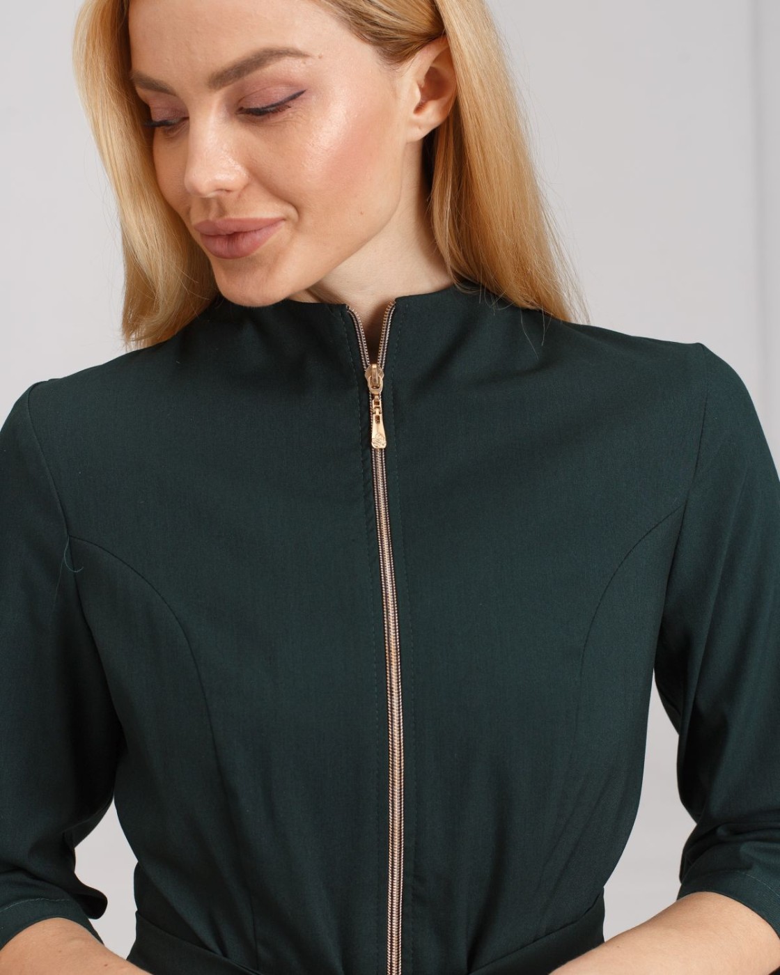 Костюм жіночий медичний «Мішель» складається з медичної сорочки та штанів прямого фасону. Сорочка з рукавами 3/4 має оригінальний дизайн: широка баска наголошує на пропорційності фігури, а блискавка золотого кольору виступає контрастним акцентом. Є дві місткі кишені. Низ - штани прямого фасону на резинці. У комплекті є пояс-зав'язка, щоб ще більше підкреслити талію.