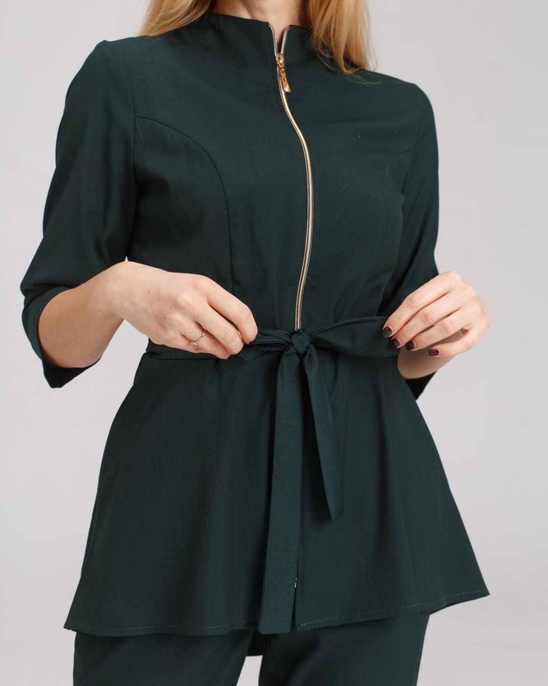 Костюм жіночий медичний «Мішель» складається з медичної сорочки та штанів прямого фасону. Сорочка з рукавами 3/4 має оригінальний дизайн: широка баска наголошує на пропорційності фігури, а блискавка золотого кольору виступає контрастним акцентом. Є дві місткі кишені. Низ - штани прямого фасону на резинці. У комплекті є пояс-зав'язка, щоб ще більше підкреслити талію.