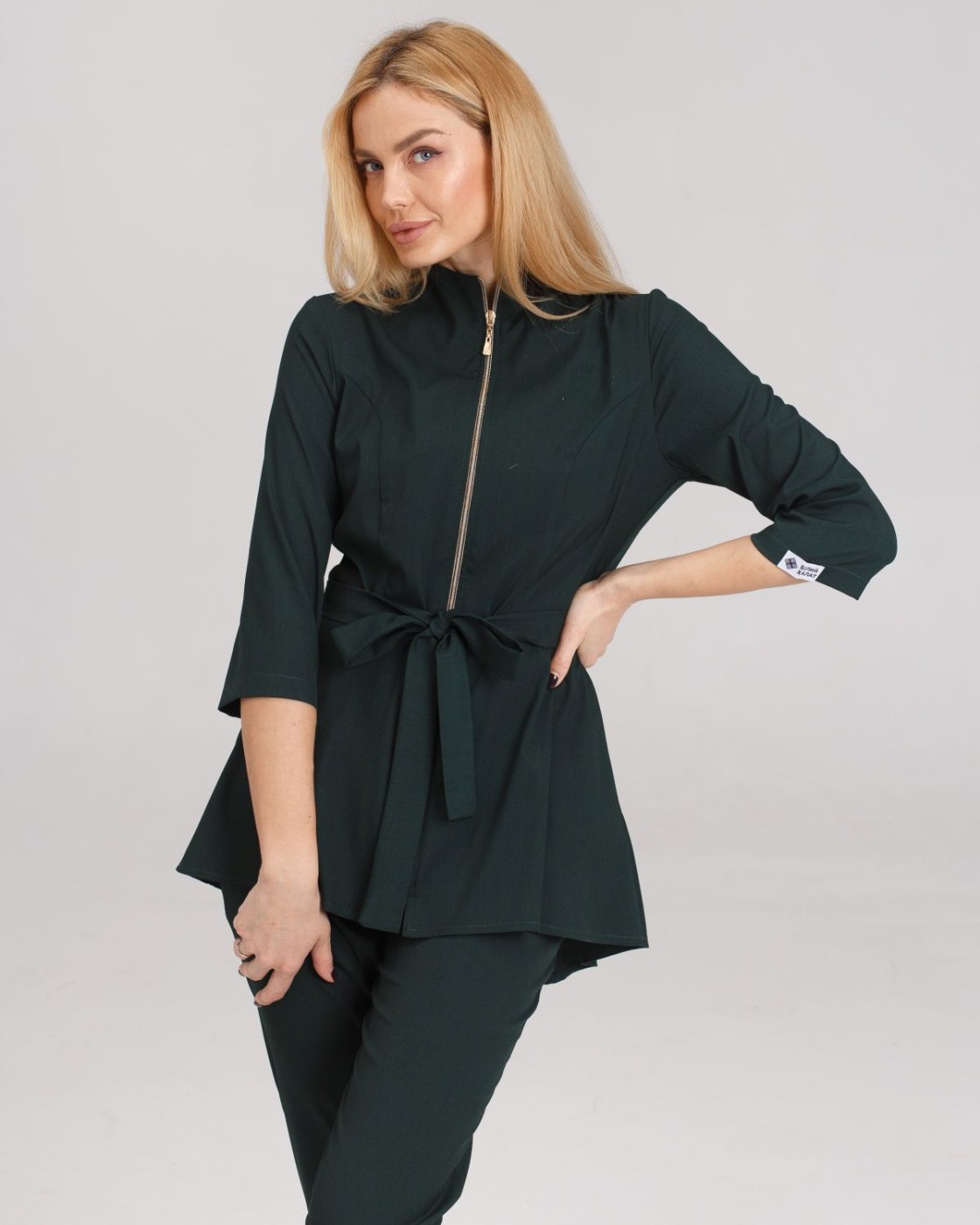 Костюм жіночий медичний «Мішель» складається з медичної сорочки та штанів прямого фасону. Сорочка з рукавами 3/4 має оригінальний дизайн: широка баска наголошує на пропорційності фігури, а блискавка золотого кольору виступає контрастним акцентом. Є дві місткі кишені. Низ - штани прямого фасону на резинці. У комплекті є пояс-зав'язка, щоб ще більше підкреслити талію.