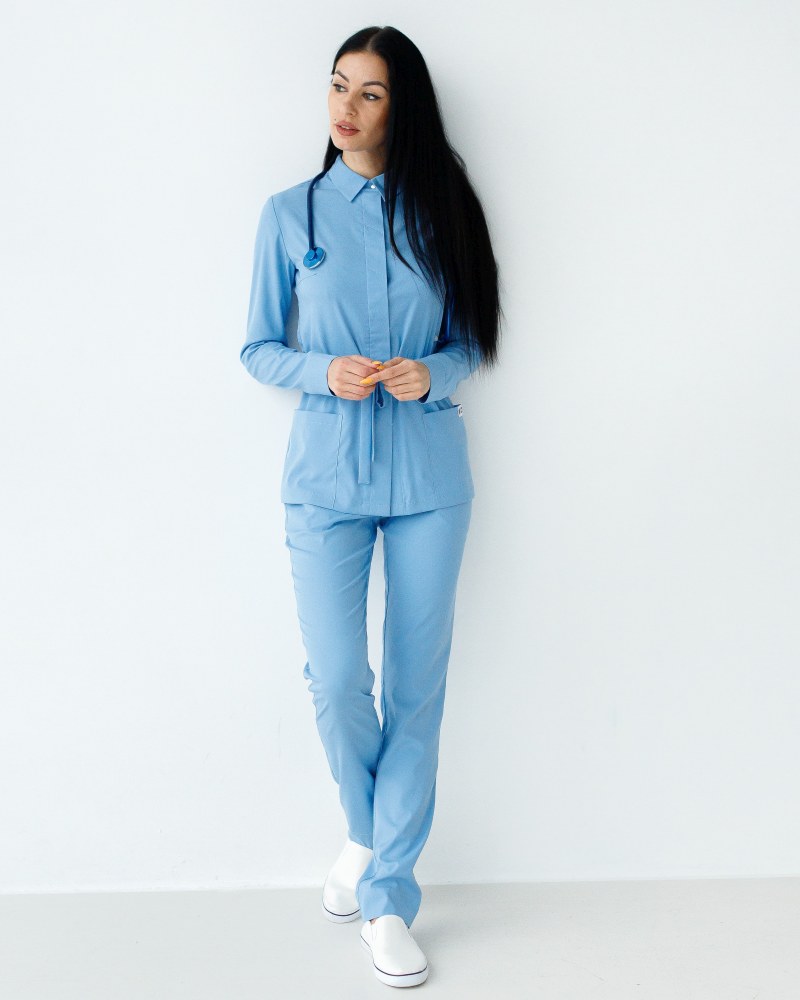 Медичний жіночий костюм «Монтана» складається з медичної сорочки на кнопках і штанів. Сорочка має стояче-відкладний комір, який можна застебнути під самий верх або залишити неглибоке декольте, розстебнувши кілька верхніх кнопок. Є дві місткі накладні кишені, а манжет рукавів фіксується потайними кнопками. Пояс-куліска підкреслює лінію талії і при цьому не сковує рухи. Низ – штани прямого фасону з еластичною гумкою на талії та двома втачними кишенями.