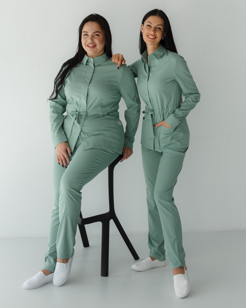 Медичний жіночий костюм «Монтана» складається з медичної сорочки на кнопках і штанів. Сорочка має стояче-відкладний комір, який можна застебнути під самий верх або залишити неглибоке декольте, розстебнувши кілька верхніх кнопок. Є дві місткі накладні кишені, а манжет рукавів фіксується потайними кнопками. Пояс-куліска підкреслює лінію талії і при цьому не сковує рухи. Низ – штани прямого фасону з еластичною гумкою на талії та двома втачними кишенями.