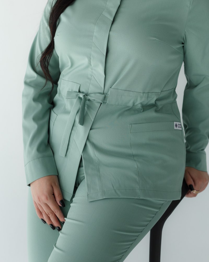 Медичний жіночий костюм «Монтана» складається з медичної сорочки на кнопках і штанів. Сорочка має стояче-відкладний комір, який можна застебнути під самий верх або залишити неглибоке декольте, розстебнувши кілька верхніх кнопок. Є дві місткі накладні кишені, а манжет рукавів фіксується потайними кнопками. Пояс-куліска підкреслює лінію талії і при цьому не сковує рухи. Низ – штани прямого фасону з еластичною гумкою на талії та двома втачними кишенями.