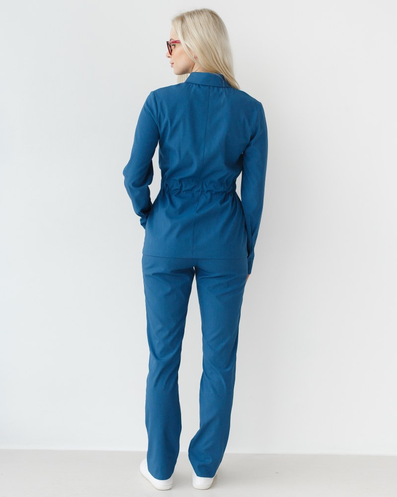 Медичний жіночий костюм «Монтана» складається з медичної сорочки на кнопках і штанів. Сорочка має стояче-відкладний комір, який можна застебнути під самий верх або залишити неглибоке декольте, розстебнувши кілька верхніх кнопок. Є дві місткі накладні кишені, а манжет рукавів фіксується потайними кнопками. Пояс-куліска підкреслює лінію талії і при цьому не сковує рухи. Низ – штани прямого фасону з еластичною гумкою на талії та двома втачними кишенями.