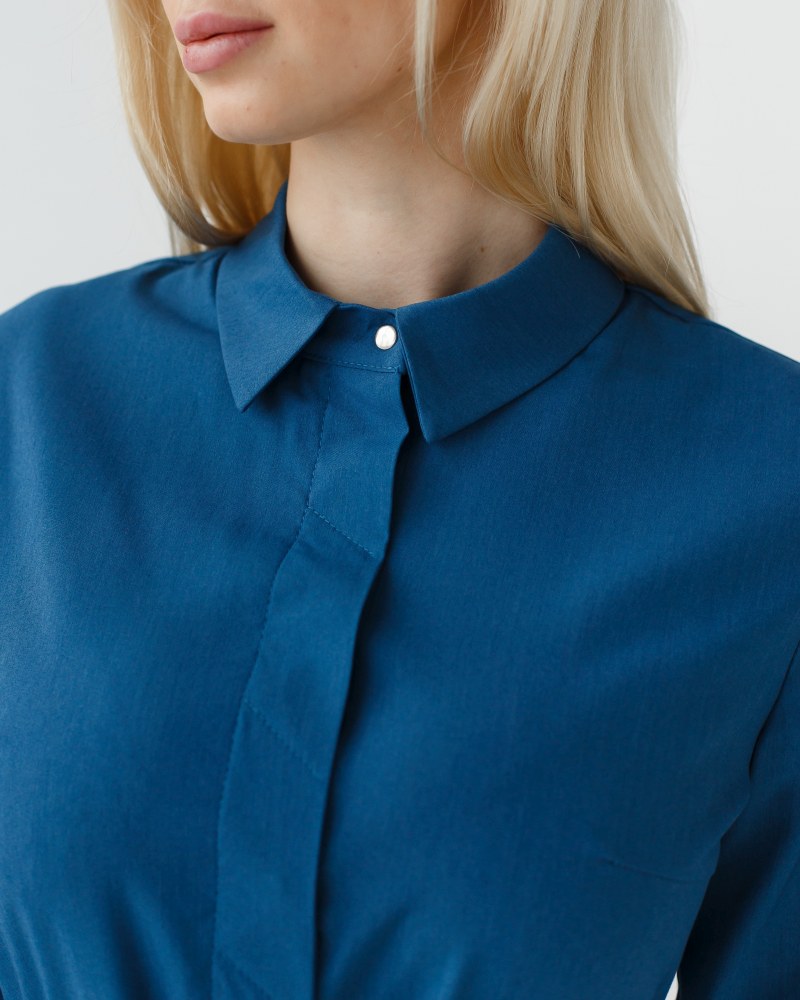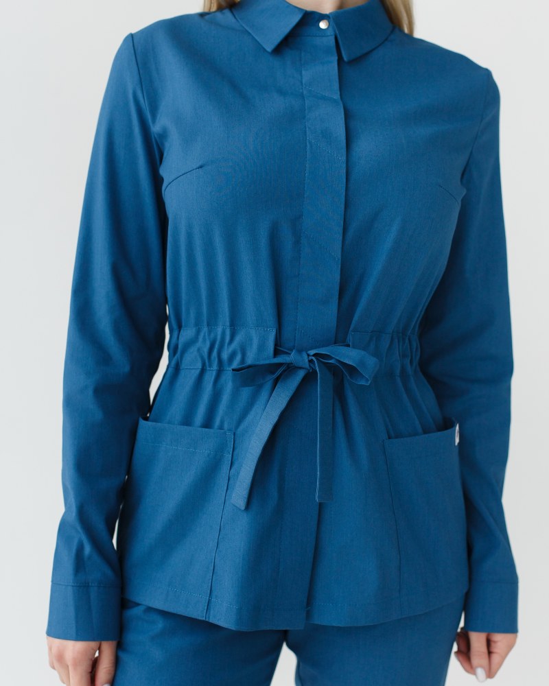 Медичний жіночий костюм «Монтана» складається з медичної сорочки на кнопках і штанів. Сорочка має стояче-відкладний комір, який можна застебнути під самий верх або залишити неглибоке декольте, розстебнувши кілька верхніх кнопок. Є дві місткі накладні кишені, а манжет рукавів фіксується потайними кнопками. Пояс-куліска підкреслює лінію талії і при цьому не сковує рухи. Низ – штани прямого фасону з еластичною гумкою на талії та двома втачними кишенями.
