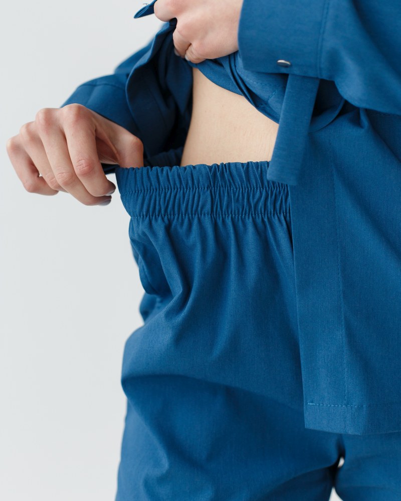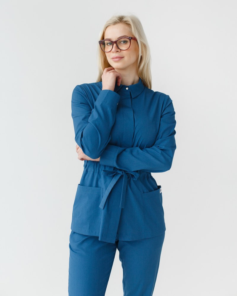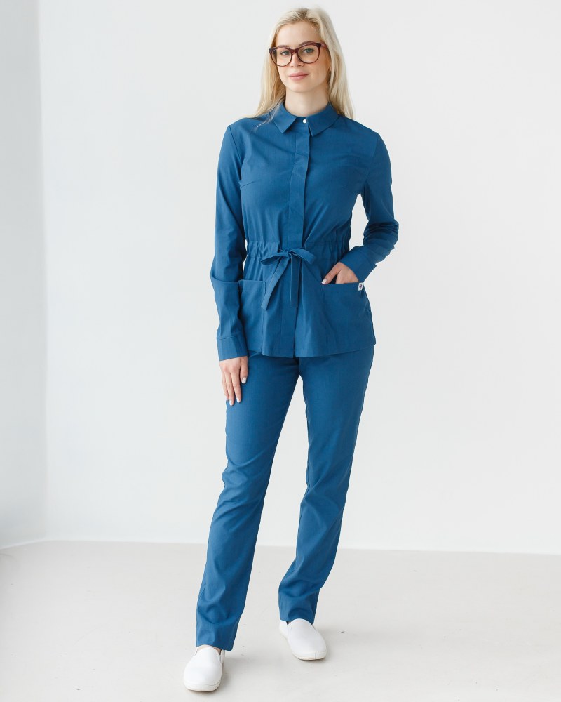 Медичний жіночий костюм «Монтана» складається з медичної сорочки на кнопках і штанів. Сорочка має стояче-відкладний комір, який можна застебнути під самий верх або залишити неглибоке декольте, розстебнувши кілька верхніх кнопок. Є дві місткі накладні кишені, а манжет рукавів фіксується потайними кнопками. Пояс-куліска підкреслює лінію талії і при цьому не сковує рухи. Низ – штани прямого фасону з еластичною гумкою на талії та двома втачними кишенями.