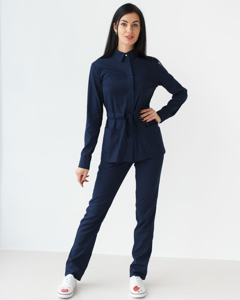 Медичний жіночий костюм «Монтана» складається з медичної сорочки на кнопках і штанів. Сорочка має стояче-відкладний комір, який можна застебнути під самий верх або залишити неглибоке декольте, розстебнувши кілька верхніх кнопок. Є дві місткі накладні кишені, а манжет рукавів фіксується потайними кнопками. Пояс-куліска підкреслює лінію талії і при цьому не сковує рухи. Низ – штани прямого фасону з еластичною гумкою на талії та двома втачними кишенями.