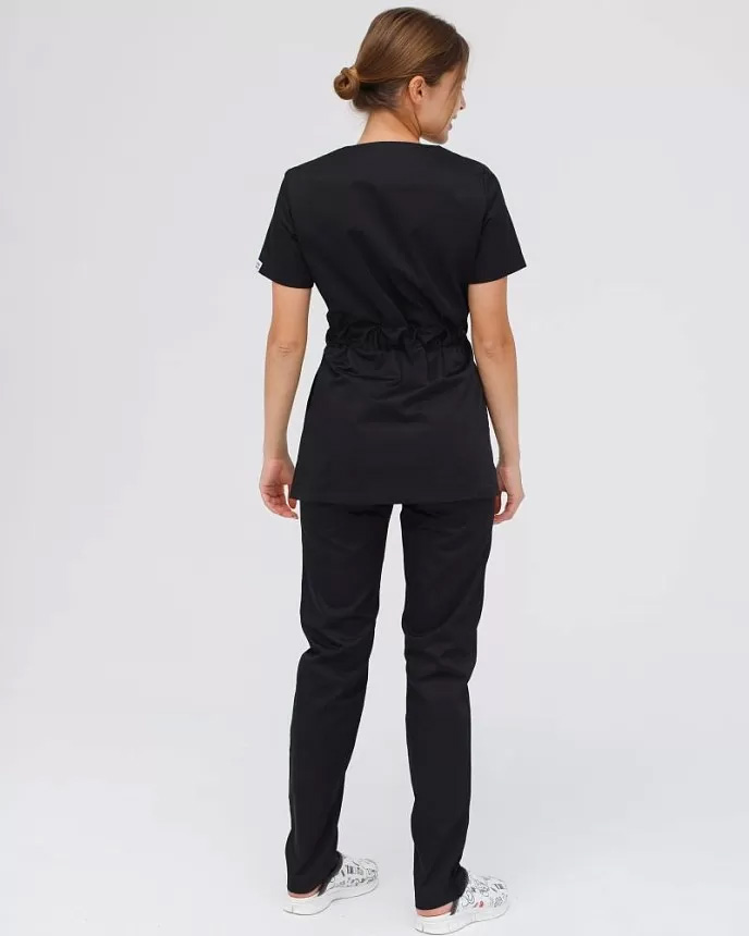 Костюм складається з медичної сорочки на кнопках та штанів. Сорочка має оригінальний асиметричний виріз горловини, короткі рукави, що застібається на ряд кнопок. Талію підкреслює пояс-куліска. Низ – штани прямого фасону з еластичною гумкою на талії та двома втачними кишенями. Зручний та стильний костюм-двійка «Наомі» сподобається не тільки практикуючим медикам, а й представницям beauty-індустрії.