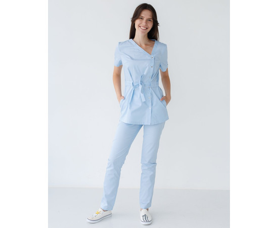 Костюм складається з медичної сорочки на кнопках та штанів. Сорочка має оригінальний асиметричний виріз горловини, короткі рукави, що застібається на ряд кнопок. Талію підкреслює пояс-куліска. Низ – штани прямого фасону з еластичною гумкою на талії та двома втачними кишенями. Зручний та стильний костюм-двійка «Наомі» сподобається не тільки практикуючим медикам, а й представницям beauty-індустрії.