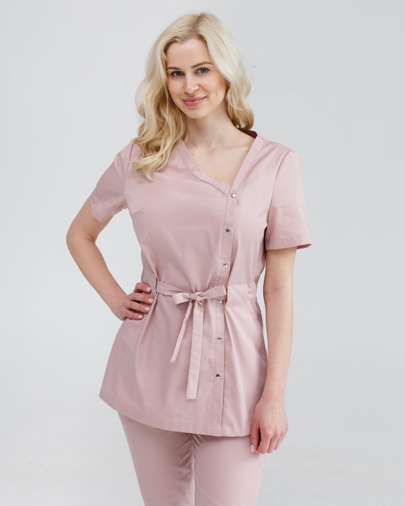 Костюм складається з медичної сорочки на кнопках та штанів. Сорочка має оригінальний асиметричний виріз горловини, короткі рукави, що застібається на ряд кнопок. Талію підкреслює пояс-куліска. Низ – штани прямого фасону з еластичною гумкою на талії та двома втачними кишенями. Зручний та стильний костюм-двійка «Наомі» сподобається не тільки практикуючим медикам, а й представницям beauty-індустрії.