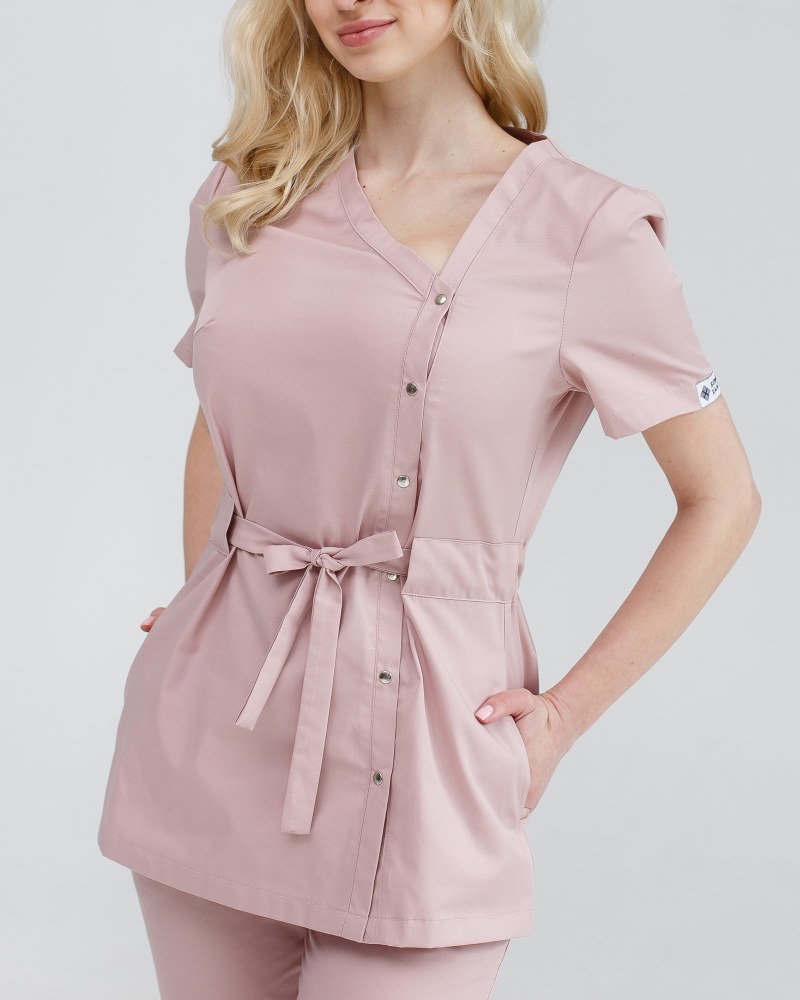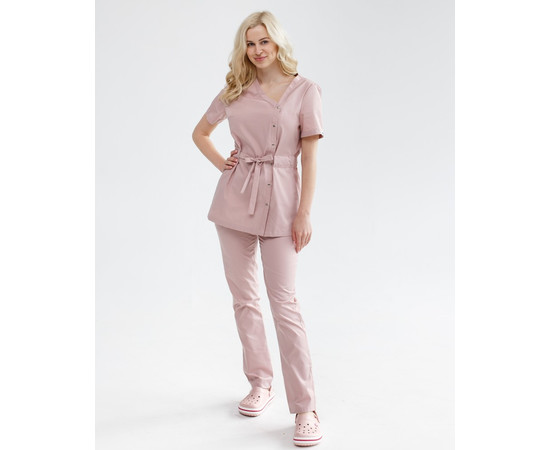 Костюм складається з медичної сорочки на кнопках та штанів. Сорочка має оригінальний асиметричний виріз горловини, короткі рукави, що застібається на ряд кнопок. Талію підкреслює пояс-куліска. Низ – штани прямого фасону з еластичною гумкою на талії та двома втачними кишенями. Зручний та стильний костюм-двійка «Наомі» сподобається не тільки практикуючим медикам, а й представницям beauty-індустрії.