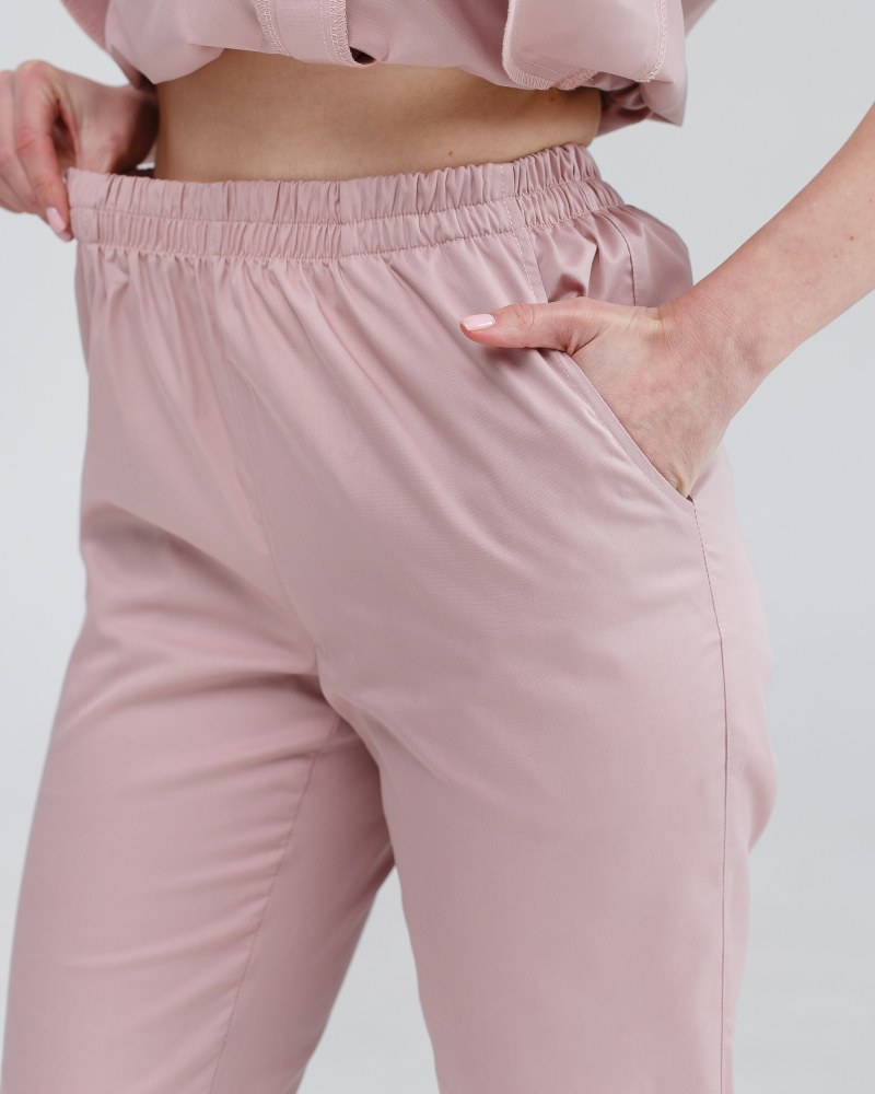 Костюм складається з медичної сорочки на кнопках та штанів. Сорочка має оригінальний асиметричний виріз горловини, короткі рукави, що застібається на ряд кнопок. Талію підкреслює пояс-куліска. Низ – штани прямого фасону з еластичною гумкою на талії та двома втачними кишенями. Зручний та стильний костюм-двійка «Наомі» сподобається не тільки практикуючим медикам, а й представницям beauty-індустрії.