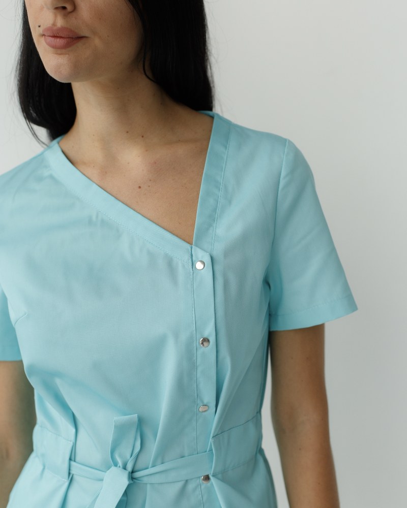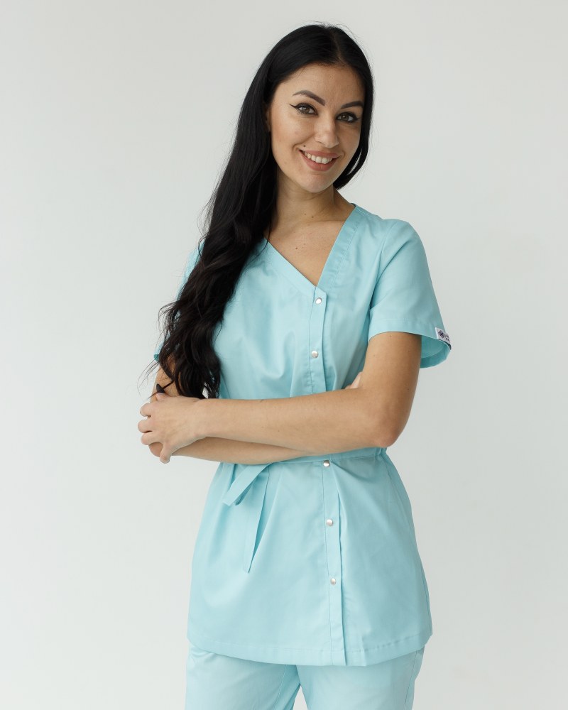 Костюм складається з медичної сорочки на кнопках та штанів. Сорочка має оригінальний асиметричний виріз горловини, короткі рукави, що застібається на ряд кнопок. Талію підкреслює пояс-куліска. Низ – штани прямого фасону з еластичною гумкою на талії та двома втачними кишенями. Зручний та стильний костюм-двійка «Наомі» сподобається не тільки практикуючим медикам, а й представницям beauty-індустрії.