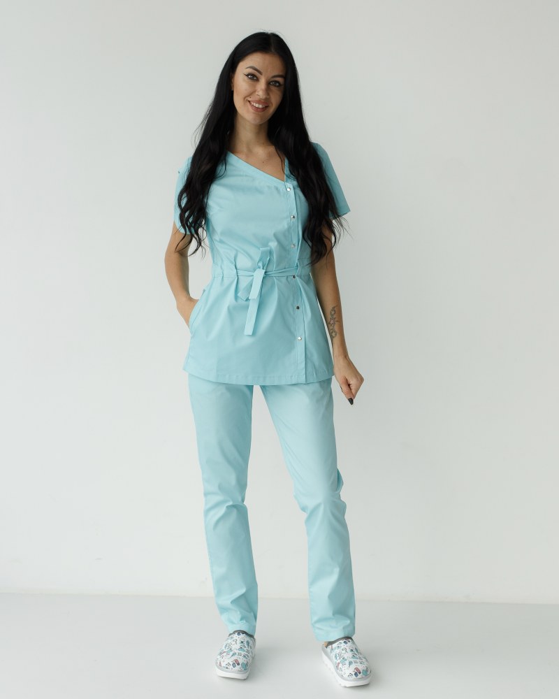 Костюм складається з медичної сорочки на кнопках та штанів. Сорочка має оригінальний асиметричний виріз горловини, короткі рукави, що застібається на ряд кнопок. Талію підкреслює пояс-куліска. Низ – штани прямого фасону з еластичною гумкою на талії та двома втачними кишенями. Зручний та стильний костюм-двійка «Наомі» сподобається не тільки практикуючим медикам, а й представницям beauty-індустрії.