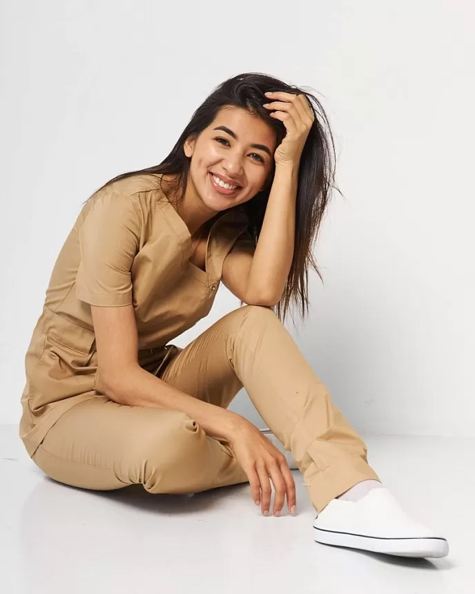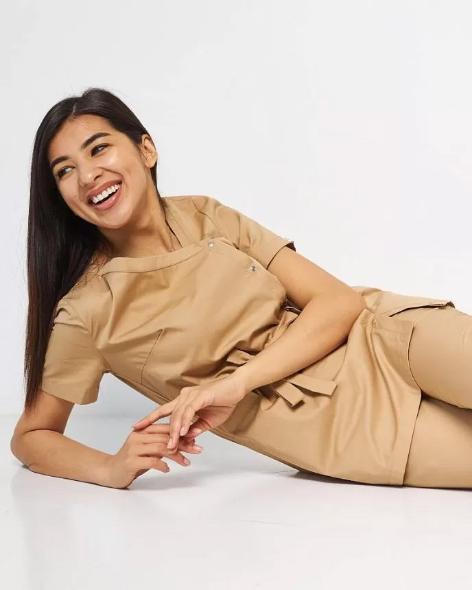 Костюм складається з медичної сорочки на кнопках та штанів. Сорочка має оригінальний асиметричний виріз горловини, короткі рукави, що застібається на ряд кнопок. Талію підкреслює пояс-куліска. Низ – штани прямого фасону з еластичною гумкою на талії та двома втачними кишенями. Зручний та стильний костюм-двійка «Наомі» сподобається не тільки практикуючим медикам, а й представницям beauty-індустрії.