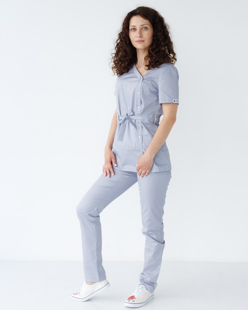 Костюм складається з медичної сорочки на кнопках та штанів. Сорочка має оригінальний асиметричний виріз горловини, короткі рукави, що застібається на ряд кнопок. Талію підкреслює пояс-куліска. Низ – штани прямого фасону з еластичною гумкою на талії та двома втачними кишенями. Зручний та стильний костюм-двійка «Наомі» сподобається не тільки практикуючим медикам, а й представницям beauty-індустрії.