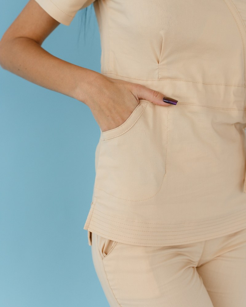 Костюм складається з медичної сорочки з коротким рукавом і звужених штанів. Сорочка з імітацією запаху має пояс-зав'язку. Такий крій наголошує на фігурі, не обмежуючи руху. Штани на еластичній гумці доповнені місткими кишенями.