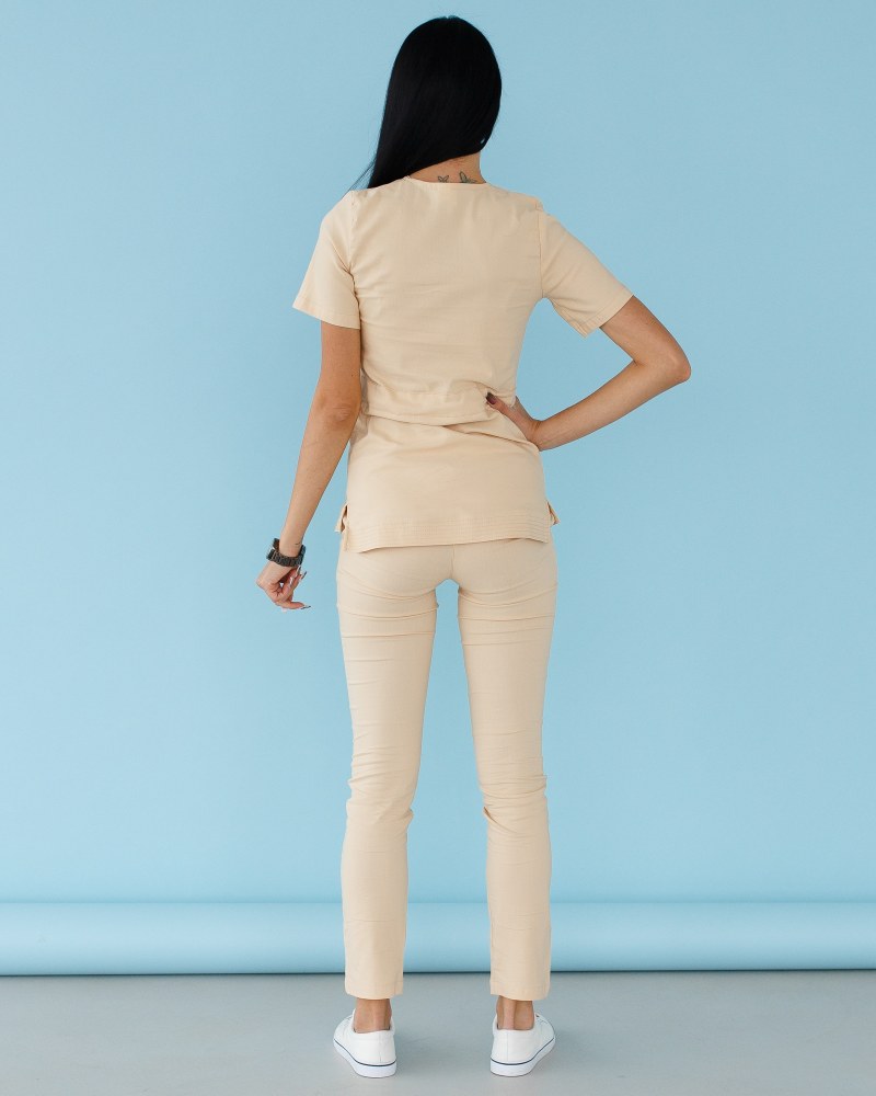 Костюм складається з медичної сорочки з коротким рукавом і звужених штанів. Сорочка з імітацією запаху має пояс-зав'язку. Такий крій наголошує на фігурі, не обмежуючи руху. Штани на еластичній гумці доповнені місткими кишенями.