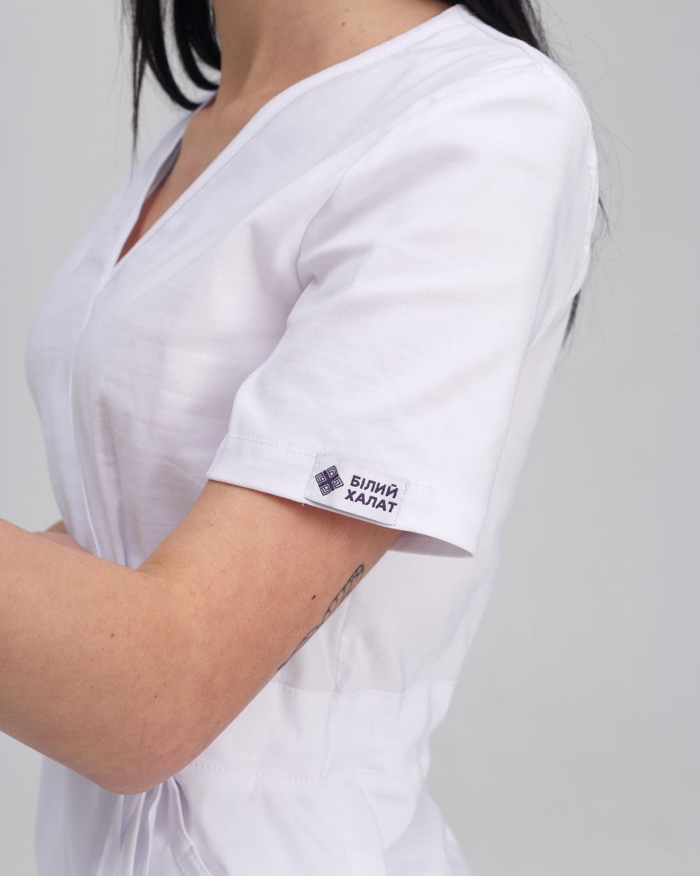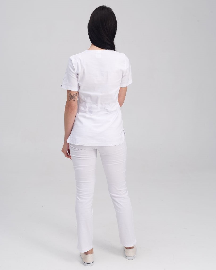 Костюм складається з медичної сорочки з коротким рукавом і звужених штанів. Сорочка з імітацією запаху має пояс-зав'язку. Такий крій наголошує на фігурі, не обмежуючи руху. Штани на еластичній гумці доповнені місткими кишенями.