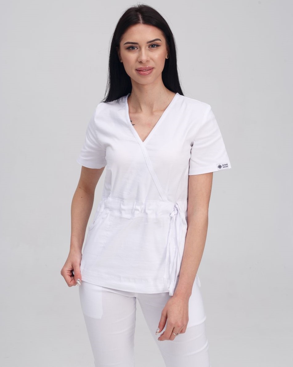 Костюм складається з медичної сорочки з коротким рукавом і звужених штанів. Сорочка з імітацією запаху має пояс-зав'язку. Такий крій наголошує на фігурі, не обмежуючи руху. Штани на еластичній гумці доповнені місткими кишенями.