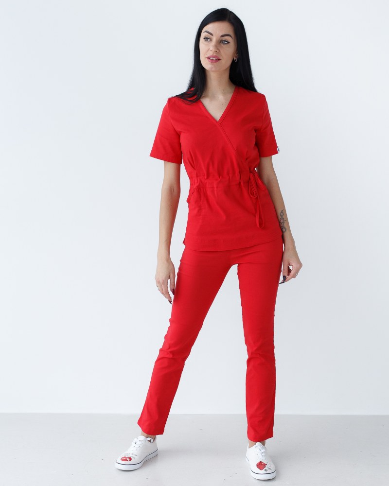 Костюм складається з медичної сорочки з коротким рукавом і звужених штанів. Сорочка з імітацією запаху має пояс-зав'язку. Такий крій наголошує на фігурі, не обмежуючи руху. Штани на еластичній гумці доповнені місткими кишенями.