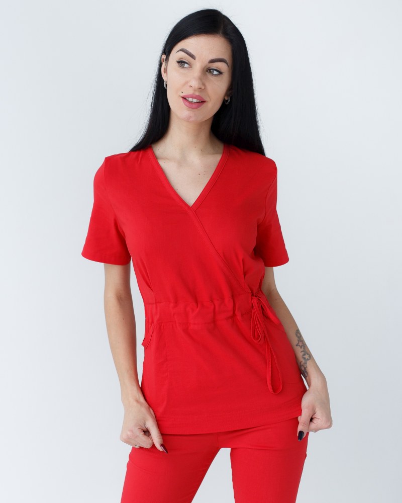 Костюм складається з медичної сорочки з коротким рукавом і звужених штанів. Сорочка з імітацією запаху має пояс-зав'язку. Такий крій наголошує на фігурі, не обмежуючи руху. Штани на еластичній гумці доповнені місткими кишенями.