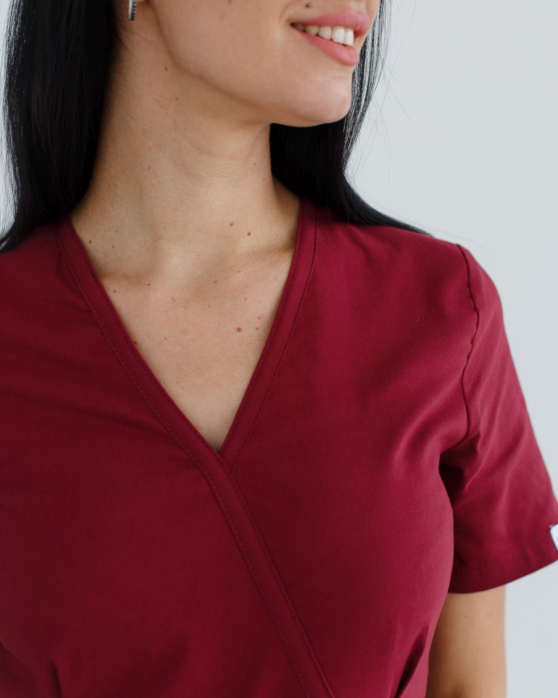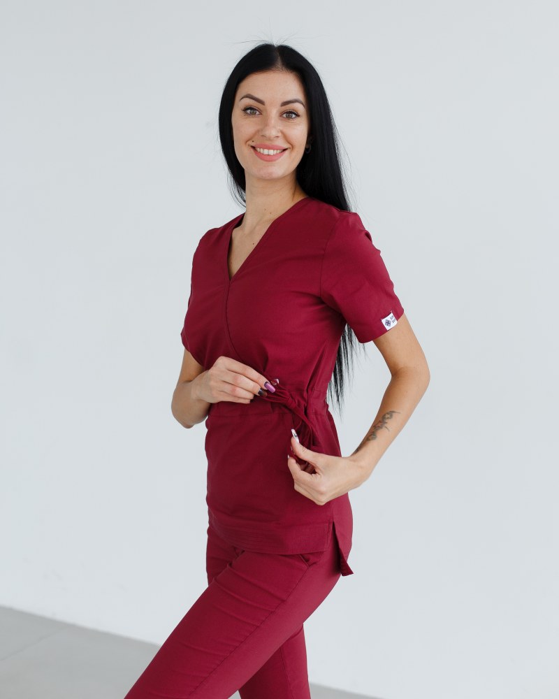 Костюм складається з медичної сорочки з коротким рукавом і звужених штанів. Сорочка з імітацією запаху має пояс-зав'язку. Такий крій наголошує на фігурі, не обмежуючи руху. Штани на еластичній гумці доповнені місткими кишенями.