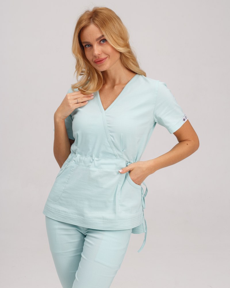 Костюм складається з медичної сорочки з коротким рукавом і звужених штанів. Сорочка з імітацією запаху має пояс-зав'язку. Такий крій наголошує на фігурі, не обмежуючи руху. Штани на еластичній гумці доповнені місткими кишенями.