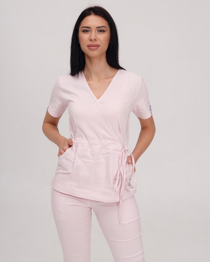 Костюм складається з медичної сорочки з коротким рукавом і звужених штанів. Сорочка з імітацією запаху має пояс-зав'язку. Такий крій наголошує на фігурі, не обмежуючи руху. Штани на еластичній гумці доповнені місткими кишенями.