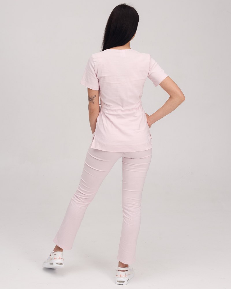 Костюм складається з медичної сорочки з коротким рукавом і звужених штанів. Сорочка з імітацією запаху має пояс-зав'язку. Такий крій наголошує на фігурі, не обмежуючи руху. Штани на еластичній гумці доповнені місткими кишенями.