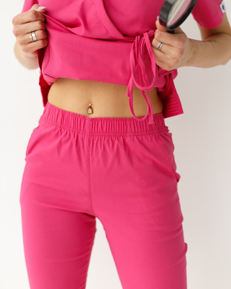 Костюм складається з медичної сорочки з коротким рукавом і звужених штанів. Сорочка з імітацією запаху має пояс-зав'язку. Такий крій наголошує на фігурі, не обмежуючи руху. Штани на еластичній гумці доповнені місткими кишенями.
