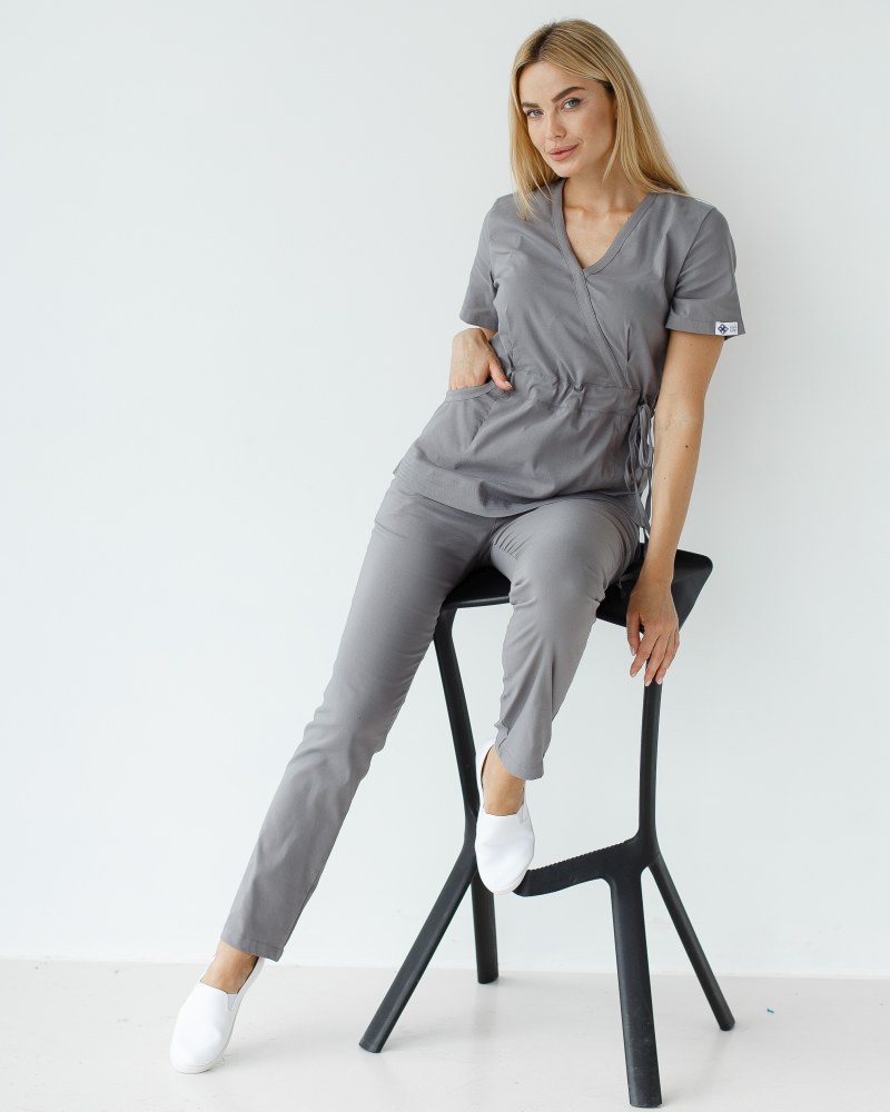 Костюм складається з медичної сорочки з коротким рукавом і звужених штанів. Сорочка з імітацією запаху має пояс-зав'язку. Такий крій наголошує на фігурі, не обмежуючи руху. Штани на еластичній гумці доповнені місткими кишенями.