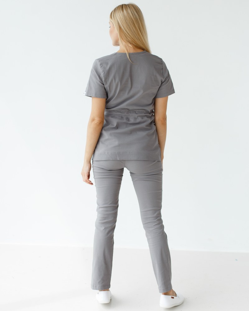 Костюм складається з медичної сорочки з коротким рукавом і звужених штанів. Сорочка з імітацією запаху має пояс-зав'язку. Такий крій наголошує на фігурі, не обмежуючи руху. Штани на еластичній гумці доповнені місткими кишенями.