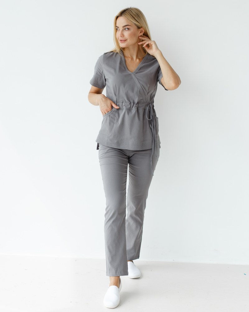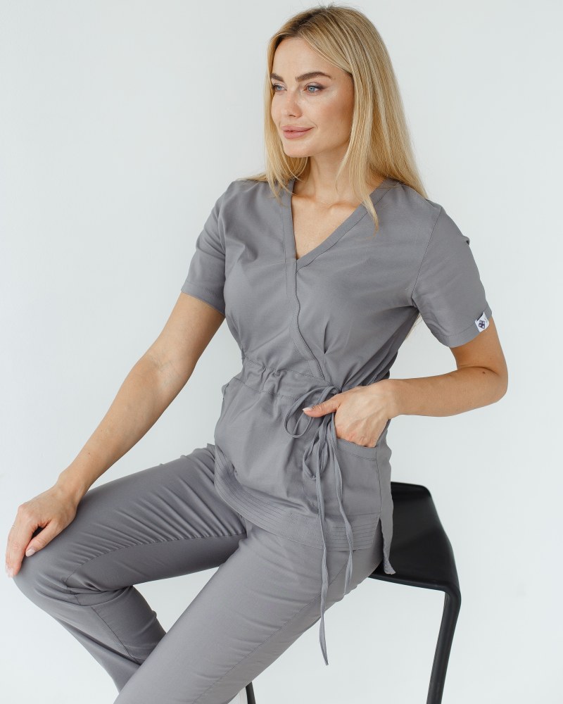 Костюм складається з медичної сорочки з коротким рукавом і звужених штанів. Сорочка з імітацією запаху має пояс-зав'язку. Такий крій наголошує на фігурі, не обмежуючи руху. Штани на еластичній гумці доповнені місткими кишенями.