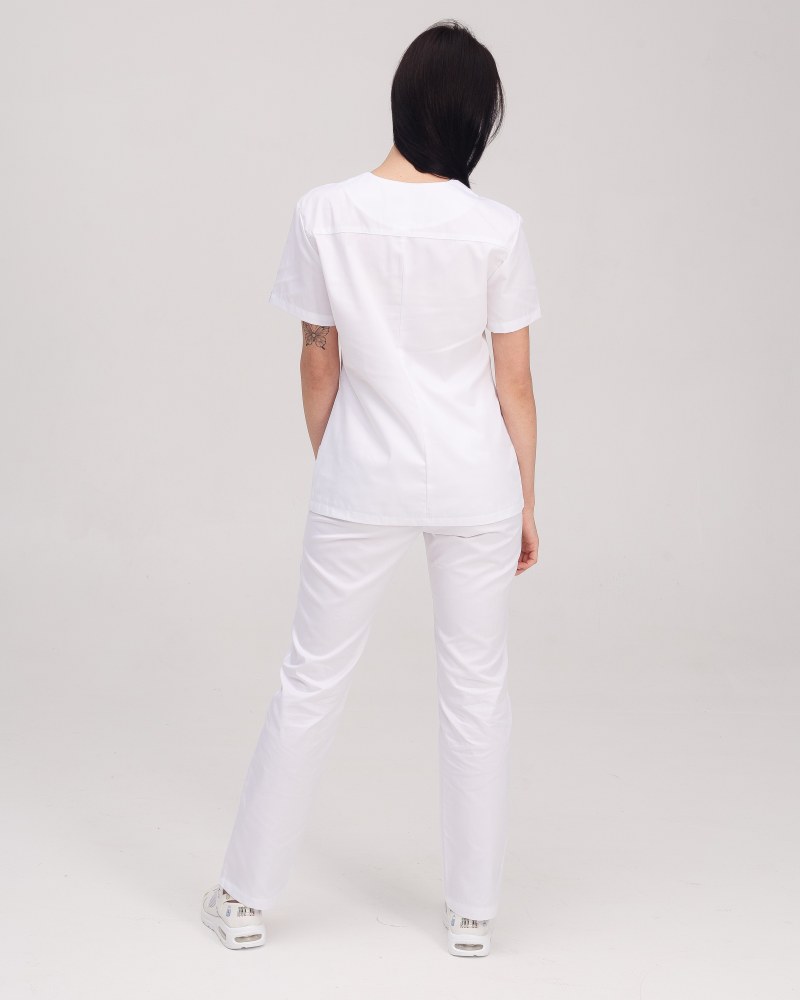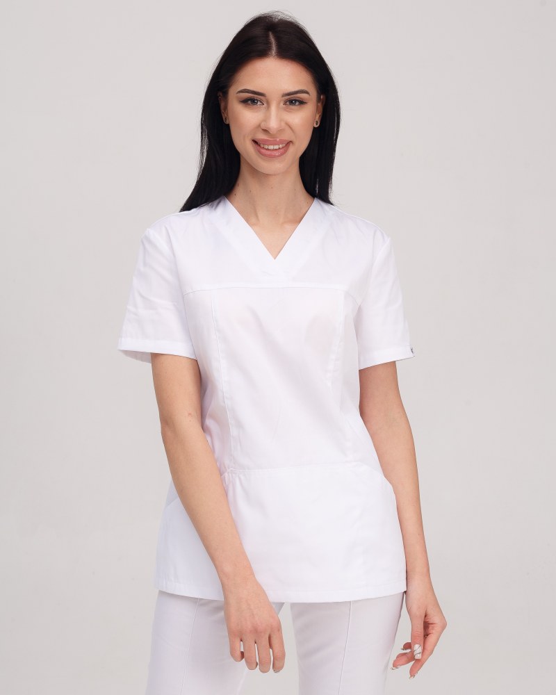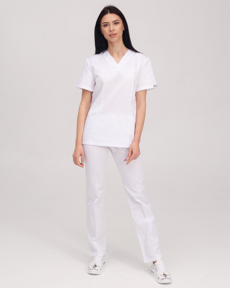 Медичний костюм «Топаз» складається з сорочки з короткими рукавами та прямих штанів. Сорочка приталеного крою доповнена фігурним вирізом горловини та кишенею «кенгуру». Прямі штани мають пояс із еластичною гумкою. Сучасний практичний дизайн, відмінна якість тканини та фасон, який підкреслює фігуру, роблять цей мед костюм жіночий оптимальним одягом для тривалих робочих буднів.