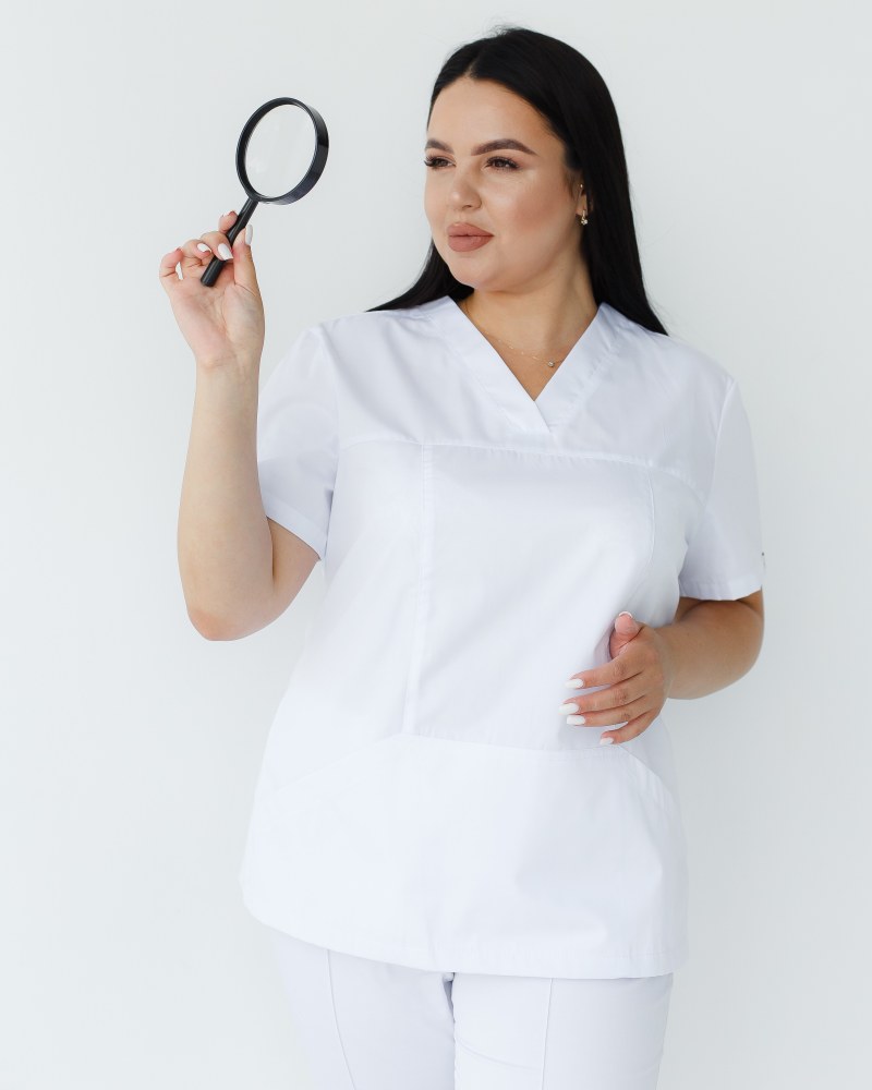 Жіночий медичний костюм "Топаз" +SIZE - бестселер лінії "+SIZE" з асортименту бренду медичного одягу "Білий Халат". Мед костюм жіночий «Топаз» +SIZE підійде для лікарів, молодшого медичного персоналу та представників індустрії краси. Це медична уніформа жіноча, яка доречно виглядає як на прийомі пацієнтів під час тривалої робочої зміни і навіть на профільній конференції. Жіночий хірургічний костюм «Топаз» +SIZE для наших покупців став синонімом зручності та практичності, а також бездоганного зовнішнього вигляду.