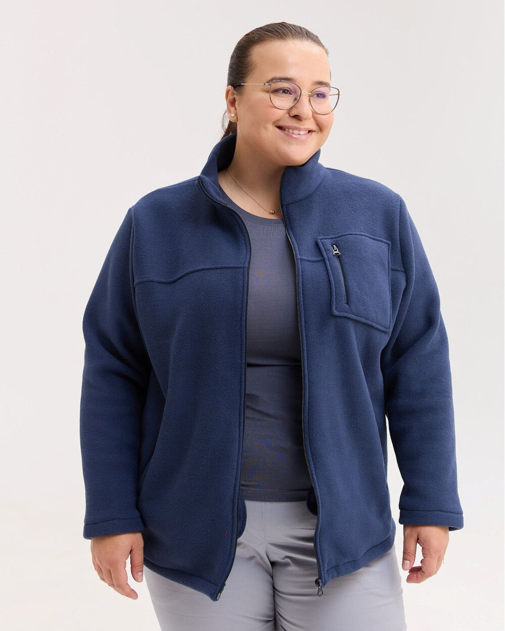 Кофта прямого силуету з коміром-стійкою, застібається на блискавку. Виріб доповнений двома місткими кишенями та нагрудною кишенею. Низ виробу за потреби можна стягувати шнуром-резинкою з фіксаторами. Виготовлена зі спеціалізованого двостороннього флісу, який краще зберігає тепло та абсолютно невибагливий у догляді.