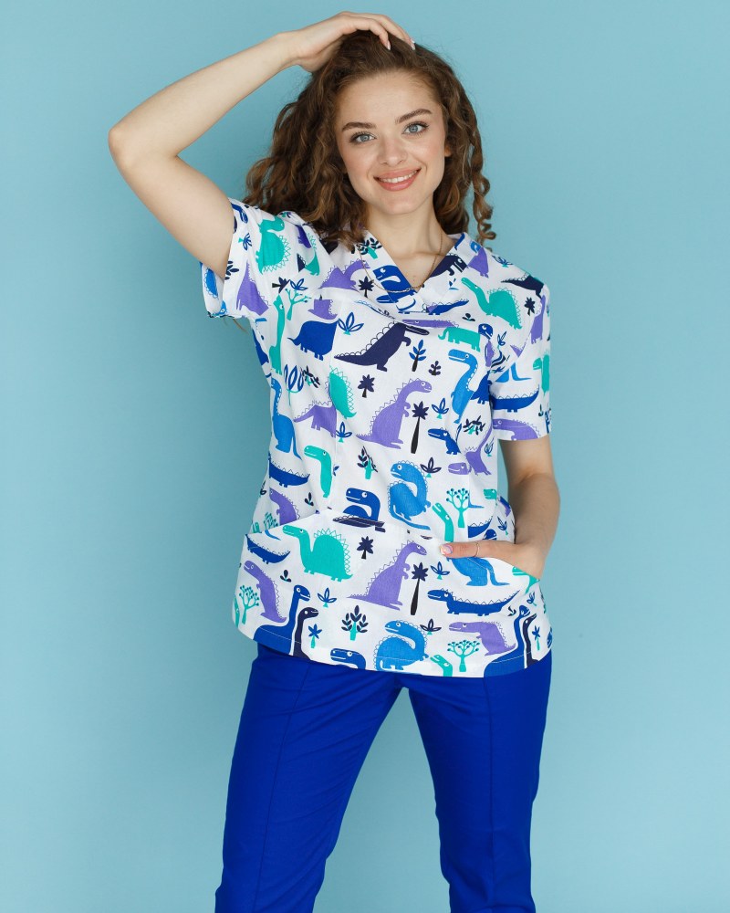 Медична сорочка жіноча Топаз принт динозаври електрик р. 42, "БІЛИЙ ХАЛАТ" 126-334-640