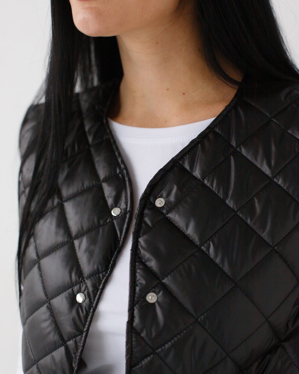Стьобана жилетка вільного силуету, застібається на кнопки. Має округлу горловину, місткі кишені, зі сторони підкладки є вішак. Утеплена синтепоном.