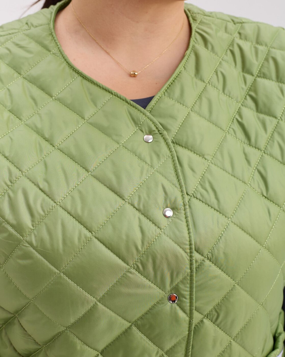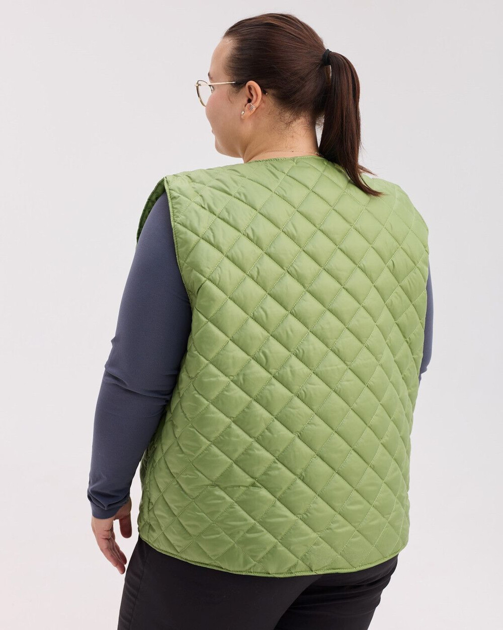 Стьобана жилетка вільного силуету, застібається на кнопки. Має округлу горловину, місткі кишені, зі сторони підкладки є вішак. Утеплена синтепоном.